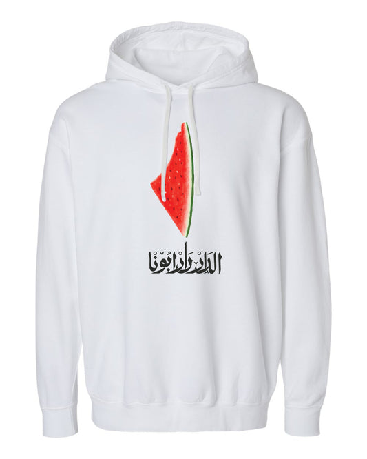A hoodie featuring the map of Palestine along with a meaningful message